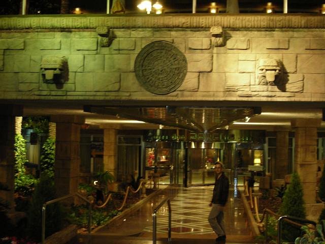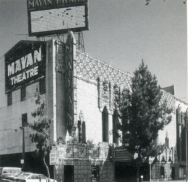 Inside, every square inch of the decor is fantastical Mayan Revival, from the floor paving to the furniture and fixtures. The entry lobby is a hall of Inscriptions and is coated with hieroglyphics. The foyer is the Hall of Feathered Serpents, In the auditorium, the huge central, polychromed plaster and metal chandelier is a replica of an Aztec calendar stone. The original painted fire safety curtain depicted Mayan jungles and temples, which completed the decorative scheme of the theatre. The Mayan Theatre, which opened with 1,491 seats, was at first a legitimate theatre, then it showed second run movies. In the 1940's, the theatre was a burlesque house and it is rumored that in 1948 a young Marilyn Monroe appeared here. By the end of the decade it tried arthouse films. From March 3rd 1950, the Mayan was the crown jewel of Francisco Fouce's chain of Mexican film venues and the first presentation was - 'Direct from Buenos Aires' one of Latin America's biggest stars Libertad Lamarque, 'live on stage and on the screen'. The theatre became an adult porn theatre in the early 1970's (some of the films were shot in the basement of the theatre) and around 1977 it was converted into a triple-screen theatre, still screening adult movies. The auditorium has now been de-tripled and the current nightclub use, replete with the theatre's original exotic Mayan interior, opened February 1990 and renamed The Mayan. |