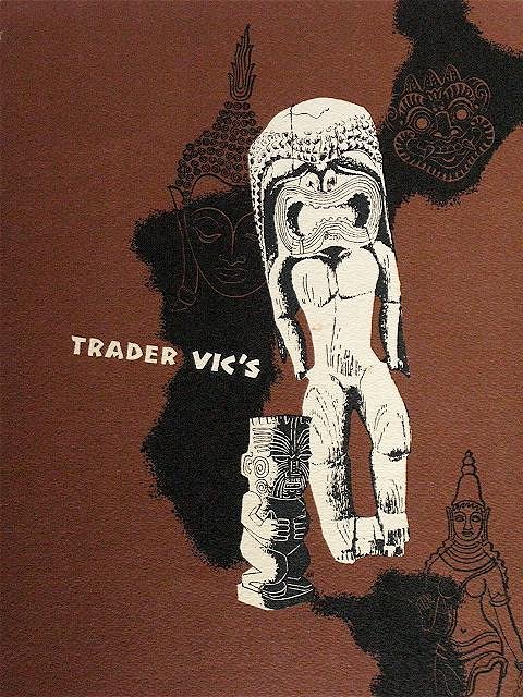 THEN: Trader Vic's menu form the opening year of the Beverly Hills Trader Vic's, copyright 1955: ...and from the New York Trader Vic's, copyright 1958: Hmmm...do we notice a difference? Now hear this: ANY and ALL elements of Polynesian pop are integral PARTS of Tiki style, which developed OUT OF Polynesian pop. But they are NOT "Tiki" on their OWN. They existed before the Tiki became the logo, and they simply are what they are (wow!): Black Velvet paintings, Hawaiiana, Hapa Haole music, etc. For something to be called Tiki Style, it must contain a majority of DEPICTIONS OF A TIKI -or some other Oceanic deity/ancestor, and stand in context to the Tiki period. Now I am not going to go down that whole ridiculous list above, just some examples, everybody can do their own math with the rest: Black Velvet paintings are....BLACK VELVET PAINTINGS! : Essential Polynesian restaurant decor = Polynesian pop (part of Tiki Style) Don The Beachcomber: INVENTOR of many features of the mainland Polynesian paradise, Trader Vic: See above-first Polynesian pop/Trader style, THEN Tiki Style = Tiki Style Both of these gentleman did begin to expand their businesses with the birth of Tiki Style, but INITIALLY WERE NOT TIKI STYLE (as evidenced in the above menus) Witco's Non-Tiki catalogue: Conquistador is conquistador, Modern is Modern, and Tiki carved furniture = Tiki Style. Wow. Post cards from Hawaii, like Hawaiiana, can be part of Tiki Style, but are not "Tiki" on their own Why would Pirates, Australia, Jimmy Buffet and much of what comes after ever be considered Tiki Style is beyond me. Every Tiki collected in a museum: They have a name for that, it's called Oceanic/Polynesian Art, and there have been lots of books written about it. Ditto for Micronesian and Papua New Guinea art, and Bishop Museum Don Ho: I explained my view above. = post-Tiki Polynesian pop/Hawaiiana Hawaiian shirts: If they have depictions of Tikis on them. (Exception to the mainland rule) = Tiki Style Luaus: Were always part of Polynesian pop culture. Hawaii 5-0. As mentioned above = Post -Tiki Polynesian pop. And here, for the "Hawaii = Tiki" lobbyists, one of the two Trader Vic's Waikiki menus known to exist ...which do not have any Tikis on them (again, one of many examples of my point) :)
