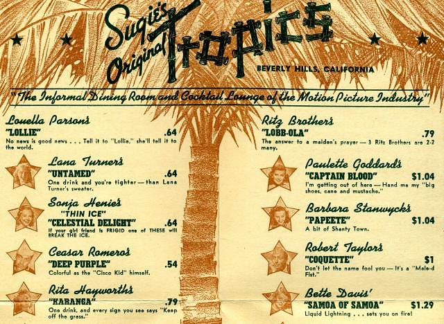 A nice concept, sort of related to, or a "reverse engineered" version of the original Hollywood star cocktail concept: While Don The Beachcomber had personalized chopsticks for his film actor clientele, Harry "Sugie" Sugarman, who had the connections to the Film community because he was the manager of Grauman's Chinese theater for a while, thought of a way to transfer the "hand-and-footprint-in-concrete" celebrity signature concept to his "Tropics" restaurant in Beverly Hills (which later became the Luau). The Tropics' original cocktail menu featured a long list of personal drink favorites which fit the name or persona of the actor: