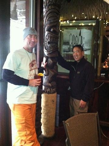 Ok, so for the third attempt in the last several years I try to order a Zombie at Lakanuki (Mammoth Lakes like all ski towns is a sausage fest). I get the same reply as the first two times... "What's a Zombie ??" :D (FYI, that's a Mai Tai above. They do have that on the menu.) Oh well, at least this has to be the highest elevation (at 8100 feet) Tiki bar ever in existence. Here's me and heylownine with a Tiki that towers over all...