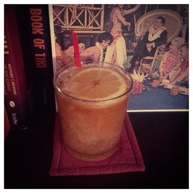 Here’s another formula I’ve been tweaking for a while: The Golden Forbidden Lei (the name again suggested by the Tiki Bar Name Generator).