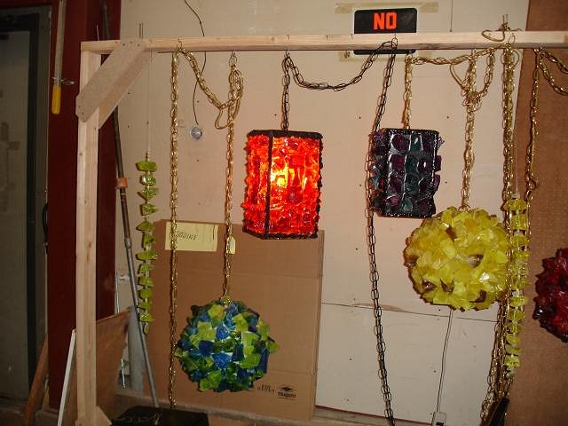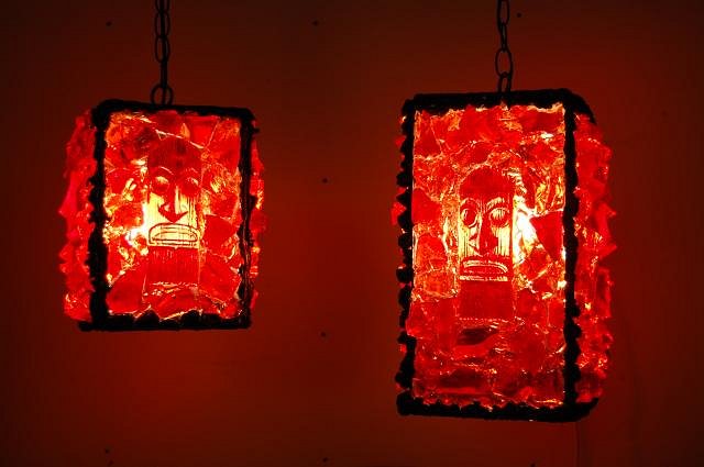 Hi Sven do you still have three trampolines in your front yard? We would love to visit with WestADad someday. Here are the lamps that will be hung soon in our home. It will give you all ideas on how you too may customize a lamp. The multicolored one is just Moais no God of light. Roge will do them any way you like. Merry Christmas, Wendy