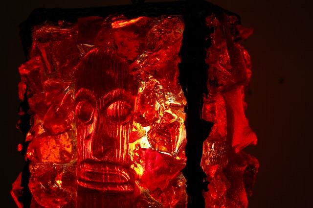 Hi Friends, I'm posting information for a dear friend Roge. Wendy IN HIS OWN WORDS! A NOTE FOR THE NEAR FUTURE: WE WILL BE PRESENTING A NEW TIKI LAMP DESIGN. THERE WILL BE CHOICES AVAILABLE FOR CUSTOMIZING YOUR TIKI ISLAND HANGING LAMP. (Nov 30th, this evening photos & description, west coast time) WENDY CEVOLA IS NATIONALLY KNOWN FOR HER TIKI SCULPTING. SHE MADE THE ORIGINALS AND WE ARE MAKING MOLDS AND CASTINGS AND COMBINING THEM INTO A GREAT LOOKING RED ROCK TIKI LAMP. WE PLAN ON HAVING PHOTOS UP BY tonight November 30th, Pacific coast time around 6 to 8 p.m. IF YOU ARE A FAN OF HAWAII, EASTER ISLAND, TIKIS, THEN take a look, see you tonight! This Tiki Lamp has been a fun design project. I contacted Wendy Cevola to sculpt the Tiki Head and the Easter Island statue. So thanks to her artistic nature, we have the heads. I made a mold off and cast them using a red resin (per Wendy’s request) which has become part of the rock panel sides. Real Lava Rock has been added to the black putty seams. You can choose to have solid red resin rocks or a mixture of red rocks with black poured around each one to restrict the light coming through. Ask for a design form to be emailed to you. Measurements are 15 lbs, 10.5” wide x 15.5” high, a four sided rectangle with an open bottom for down light and a closed top. The lamp is wired with 15 ft of chain and 18’ of wire/plug/on-off switch and 2 ceiling hooks. The time it takes to make a unit is between 2 and 3 weeks. To Order or view his lamps go to this link later tonight. 11/30/11. This is the lamp I ordered from Roge in colors of my choice.