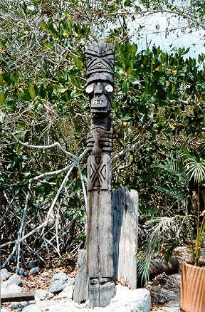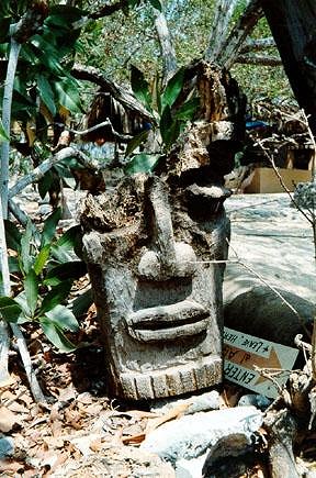 Owen's bungalows (operated by Owen Lee, ex-member of Jacques Cousteau's diving team) has thatched bungalows - and a decent restaurant for tuna steak (al mojo de ajo) on the point at the end of Playa Las Gatas. As you approach the resort, you encounter some sun-worshipped tiki figures, like these examples: