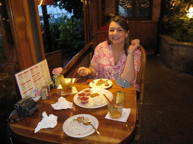 We started with the Mai Tai Sampler, a collection of their four most popular drinks - left to right, Mai Tai Quencher (we found it kind of weak, like a Mai Tai Lite), Pele's Volcanic Mai Tai (Yum! Potent and delicious), original Mai Tai, and the Green Flash, which, despite having a bit of melon liqueur in it (something I generally despise), was excellent...