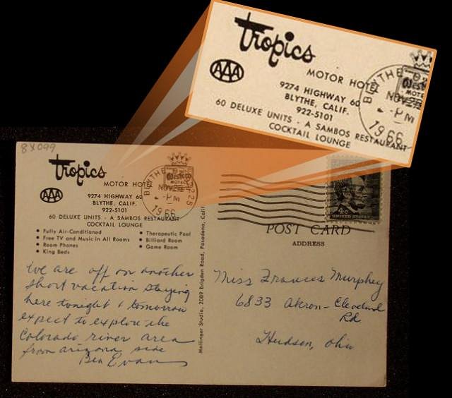 Sorry I can't help with the Blythe address. It seems almost certain that the Tropics is not standing anymore, however, it would be of interest to find out what is there now. The Indio Tropics was still there in '92 (in Indian hands), but it never had an A-frame or much other features. However, several Tikis were still standing, albeit painted, which made the nicest one, a Marquesan, look like he was wearing Blue Jeans. What was remarkable was the fact that the original sign was still in existence: