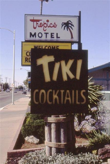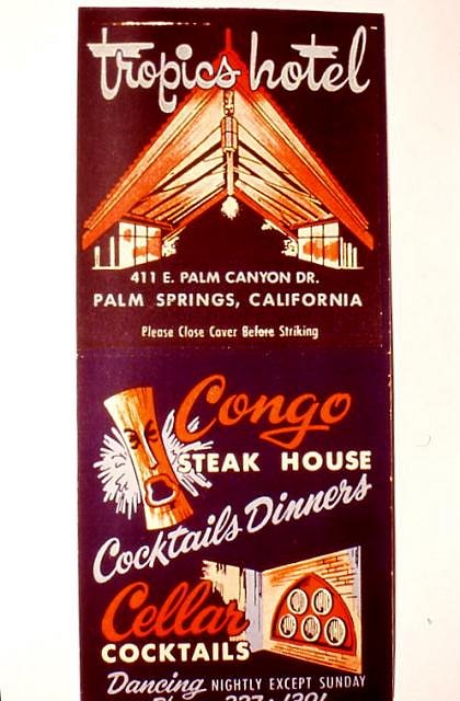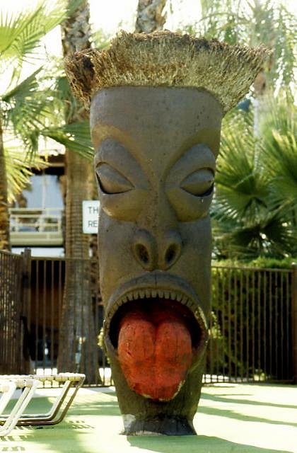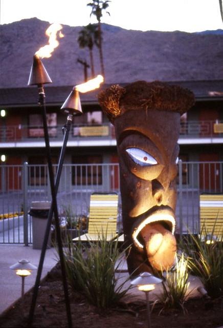 The 1972 movie "Teenage Sex Kittens" has a drive-by shot of the Tropics in Palm Springs, as well as several other buildings on the same street. The panning shot starts with the other sail sign before the Sambos, and I think ends before the second sail sign or the root-ball tiki. So I don't know whether the tiki still existed in 1972. Sabu |