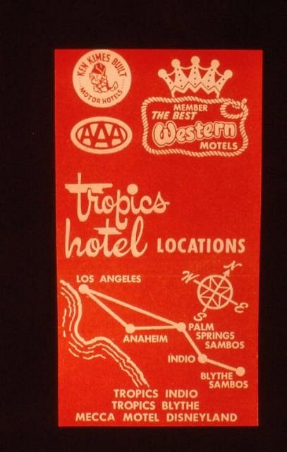 It seems like the had a tall Tiki too, you can make it out on the right of the A-frame, it looks like the one on page 115 of Tiki Modern, with the stick thru the nose. Here's a map of the Tiki Tropics locations, (plus the Mecca Motel in Anaheim which seemed to have been owned by Ken Kimes also): [ Edited by: bigbrotiki 2008-02-08 19:31 ] |
