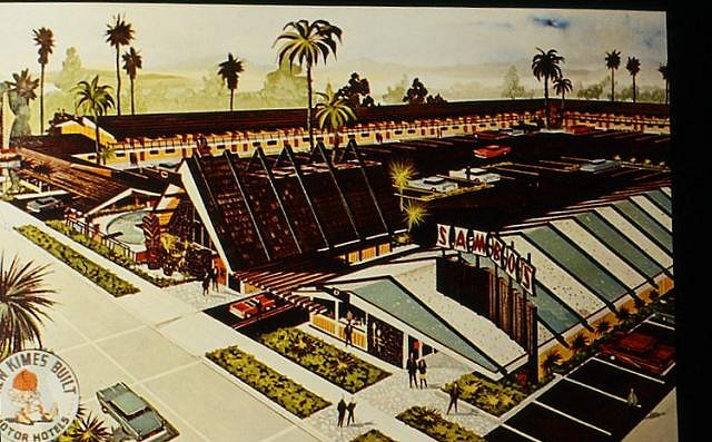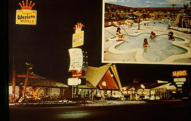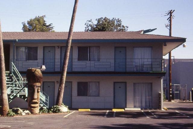 Dig? Did you say dig? Well, that reminds me of yet another facet unique in Tiki archeology regarding the Palm Springs Tropics: After it flooded, the whole place was filled in with dirt. Now THAT would be an archeological dig. The stairs down to it are behind the wall on the right, in the hallway between what used to be Sambo's (now the Mexican Restaurant) and the Reef Bar. It's a closet now, go and look in it, you see the access. Now Doug, I am really curious if there is anything left of the Blythe Tropics, you might just encounter tropic blight. It used to be pretty nice, also had an A-frame porte cochere and a Sambo's: