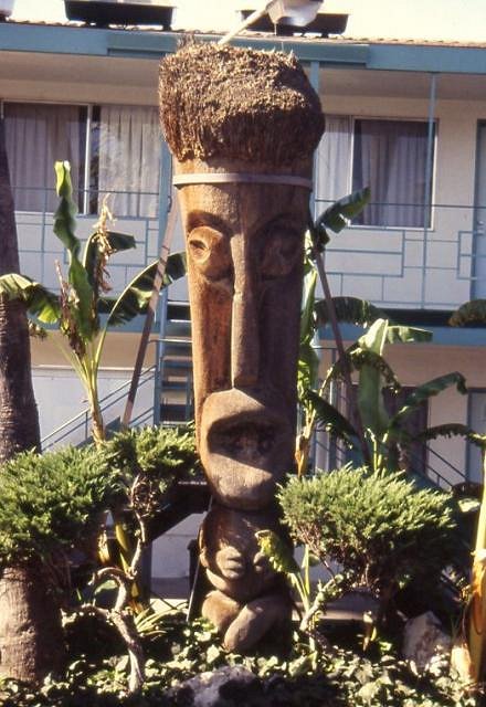 Sure...another excuse to procrastinate with the stuff I SHOULD do...:) I have a bigger version of that snapshot, problem is it that the Tiki on the left is cut off! I always believed that photo of the tall guy being at the RIGHT driveway because of the wall and the two-story Motel behind it...and because that little stone Moai is still in that spot. I could be wrong, but here is my theory: Maybe there were TWO tall Tikis, one at the right and one at the left. The one in your small photo is in silhouette, so we cannot positively ID as the Tongue Tiki. It possibly was THIS Tiki: