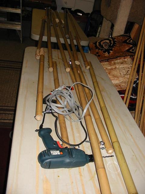 Finished the cross sections of bamboo. The hardest part was re-positioning the Stockton Islander glass float lamp. Luckily, I was able to drop it down almost parallel to the outside framing. Got to tweak the ends and do some more jute wrapping around the frame and I will be done! PTD |