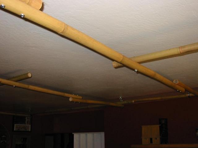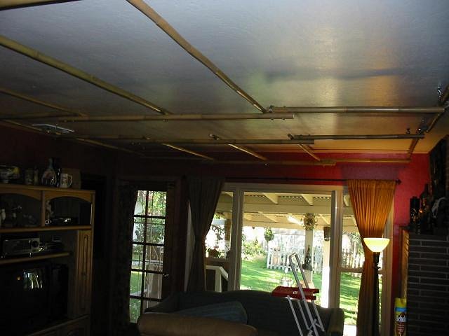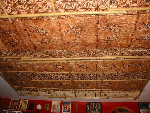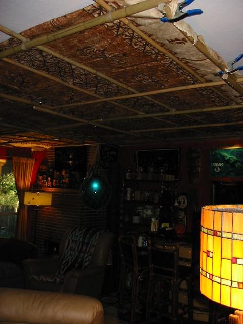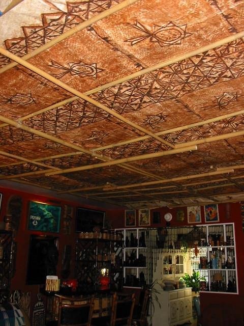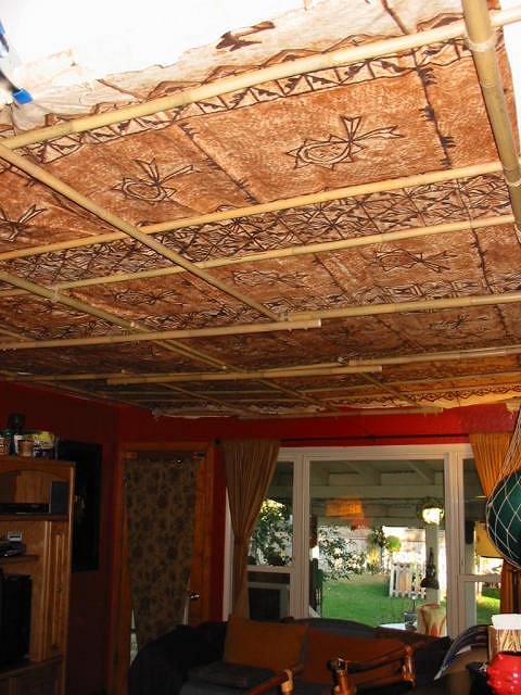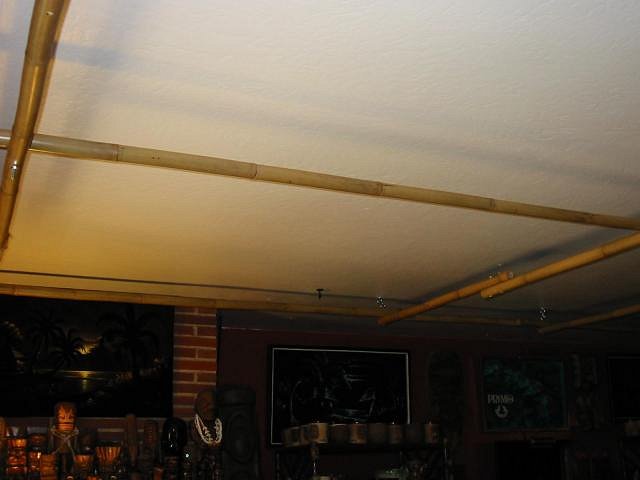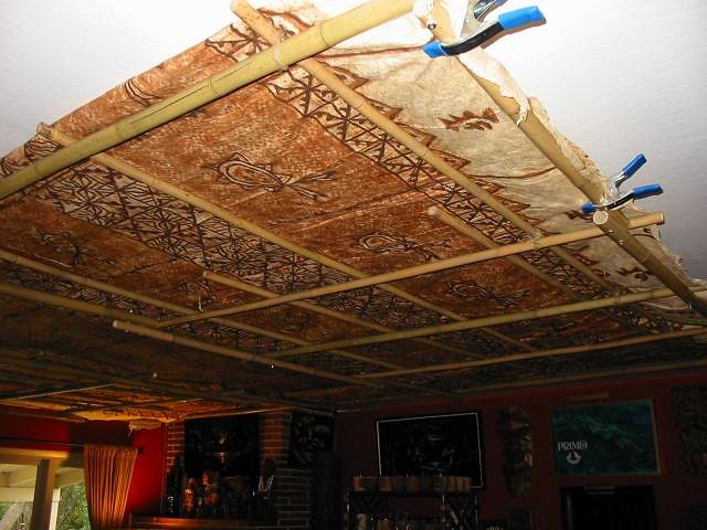 Swanky, Thanks for the feedback. I found the areas that were sagging improved greatly by what you suggested. I fed some cross sections of bamboo through the middle and this alleviated quite a bit of the sagging. I tried not to damage the tapa in any way. Even though you are saying you can find it for $1.00 per square ft, it seemed like such a nice piece I am trying to keep it it's original condition (and I didn't pay nearly that much for it). Gluing it to the ceiling was not an option for me at this time either for both aesthetic and the reason posted above. It sure makes a huge difference to the ambiance of the room and the general mood! PTD |