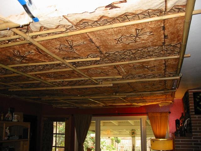 Looks good. You could have wallpaper glued it to the ceiling. Depends on your long term and it would leave some residue on the ceiling if you pulled it down. You might get some small bamboo to stick in there as more support for sagging areas. The tapa can hold it in place and you can cut it to length to over lap a few inches and just slide it in as support. I did similar stuff to support thatch in a bamboo framing. If you are willing to take the time, you can get large tapa cloth for under $1 a square foot. |