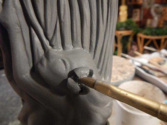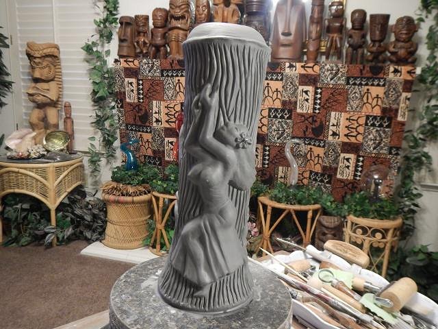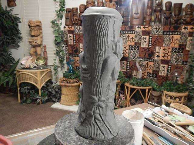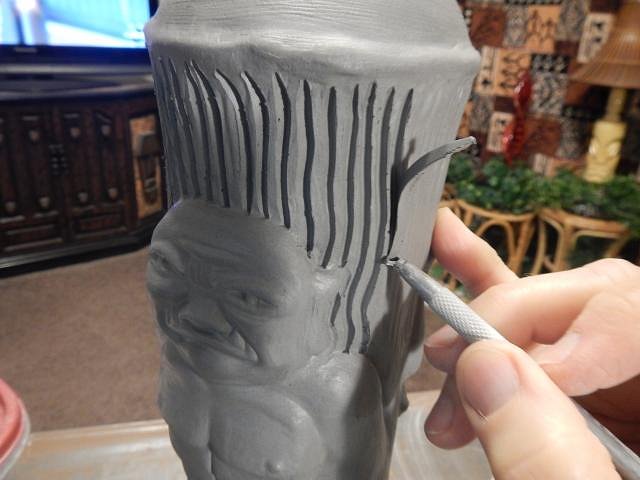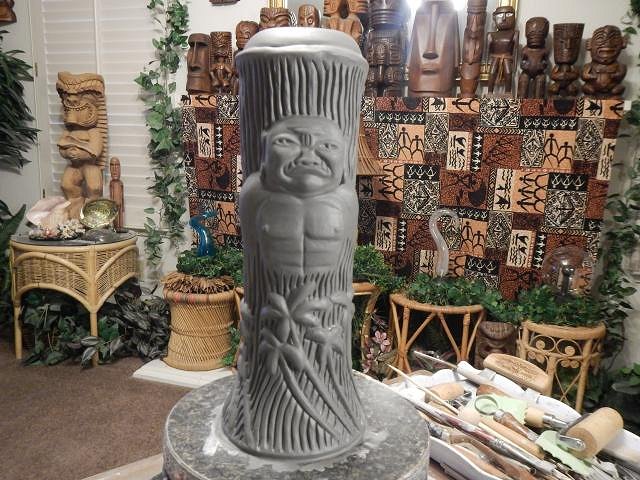 hang10tiki that carving is going to be one of your best. Frankie's is looking good. Thank you for the photos. My favorites are those with you and SewTiki in them. ============================= Update on Wish List #8 this mug is for Thomas Zocher. It will have the red flame on top. It will be the last one I do this way. The flames are as much work at a mug so NO MORE! I will still make the mug with a normal top. The mold was never good enough so I fine tune every part of the mug. I re-carve the woodgrain to make it deeper and I fine tune the zombie. Here is his side finished. Then I fine tune the other side. I either paint on a flower or in this case I add one and carve it. Here is this side finished. I'm on a roll now, working each day to make one crawl mug and to continue on with Wish List #8. Every day is fun. Wendy |