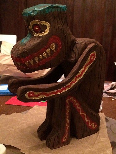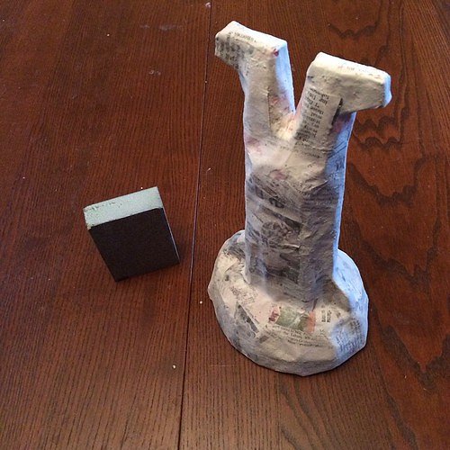 It looked a little rough, but the prototype was supposed to appear carved from wood, so I figured that was okay. I learned on Wikipedia that you can sand papier-mâché so I did a little smoothing.