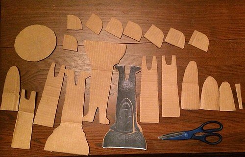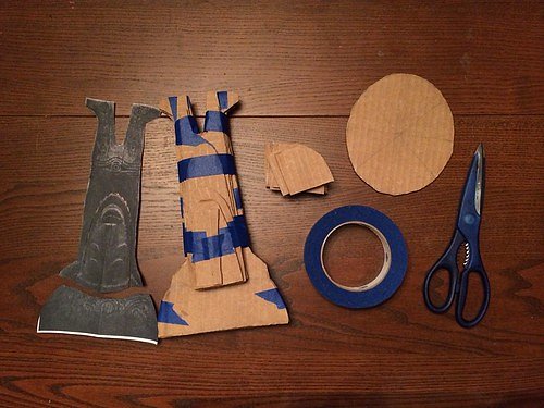 How I made it: I printed out reference photos of the Tiki Room Drummer God on 8.5x11" paper, cut out a side view, and traced it onto multiple sheets of cardboard. I cut the cardboard out, stacked the layers together, trimmed down the neck and waist (etc), then taped them together. I coated it with papier-mâché - flour and water mixed to the consistency of heavy cream, and used strips of the brown packing paper. Then set it in the sun to dry: