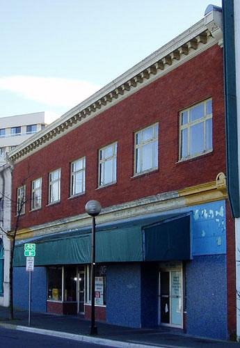 In this shot you get much more of a feel for the restaurant and the whole theme. Pretty nice looking place! I found out that this restaurant opened in 1956! Here is a little information I did find out about the building itself: "The Brumpton Block is a two-storey Edwardian Commercial style building in the downtown core. The historic place is confined to the building footprint. Designed and built by local contractor James Green in 1912, this horizontally proportioned block is a very good example of a vernacular Edwardian Commercial style building. The second floor retains its original appearance. The ground floor originally had four separate storefronts and a central entry to the top floor but was later converted to use as a single restaurant. The Brumpton Block is significant because of it's association with the Wong family and the Diner's Rendezvous Restaurant. For several decades, starting in the mid-1950s, the Diner's Rendezvous was one of the most popular restaurants in Nanaimo. The Wong family were exceptionally active in community life. The Brumpton Block is also significant because of its association with two well known and prolific Nanaimo builder-architects. Green was active in Nanaimo in the 1920s and 1930s and is best remembered for Beban House. McArravy, a formally trained architect, designed many notable buildings including City Hall and the Fitzwilliam Street Library building. A neighbourhood landmark, the Brumpton Block's long facade is very prominent on the street." Here is a picture of what the outside of the building looks like as of 2004: