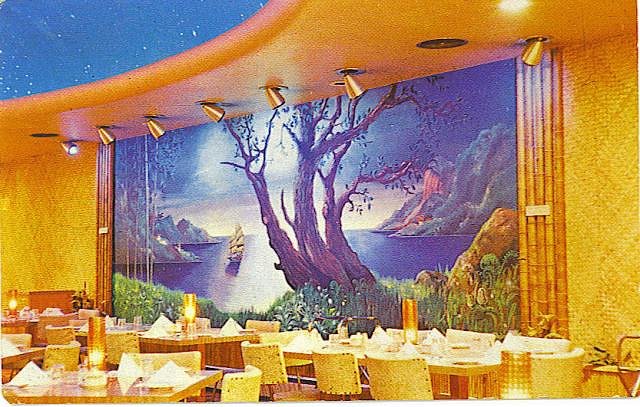 This is a shot of the bar area where you can see the completely mirrored wall behind the bar and a reflection of the ceiling, the Nite sky and the matting on the walls. Even the colors are pretty much the same. Check out the location of that mural. I like these cards!! It turns out that the building that housed the The Diners Rendezvous (Not a very cool name is it?) is now a historic landmark in BC. I do not know if the room is still there today but I got a feeling it is. It would be cool to get inside and see what it actually looks like now. Here is another cool card that I found which pretty much shows the whole interior: