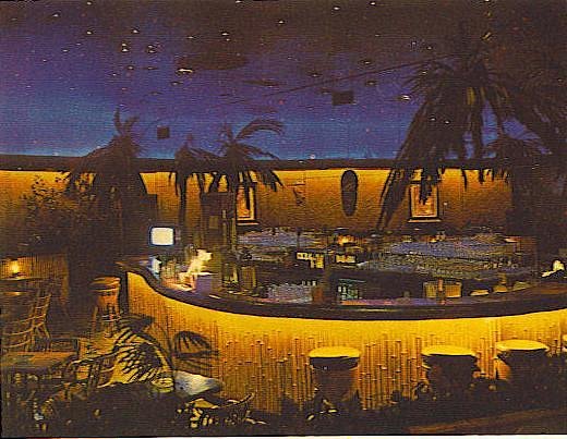 Look familiar to anyone?? How about the Waldorf Hotel?? Tahitian Lounge anyone?? The curved room with the bamboo bar and mirrors on the wall! It was pretty much bang on!! You can see this photo much clearer and see the details. This photo is actually of the wall with the mural as opposed to a photo of the reflection in the mirror as the first card. You can see a really cool Nite time scene of an old tree, moon lite, tropical foliage, and a Chinese looking 'Junk' sailing in the water. About five pieces of thick bamboo line either side of the mural with matting on the walls and all under a awesome looking curved ceiling with a Nite sky painted on it and complete with twinkling lights!! You can also see how the ceiling curves up and out just like the Waldorf Hotel and the way their sky was done. Here's a picture of the Waldorf's Tahitian Lounge: