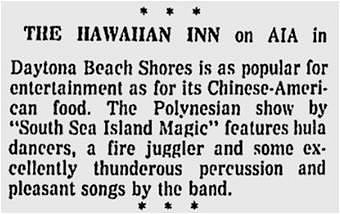 Wailana stated that “Drums of Tahiti” played at the Hawaiian Inn in 2009. This newspaper entertainment clip indicates that the show played in an earlier time at Sea World in Orlando...