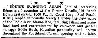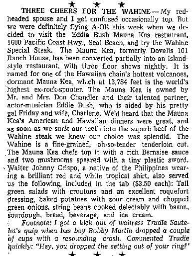 By January 1964 the Mauna Kea was no more. This article about Eddie Bush from Jan 2, 1964 talks about him managing the Mauna Kea and how it "did not survive". By then he had already moved on to performing at Mr C's Outrigger a little further up PCH.