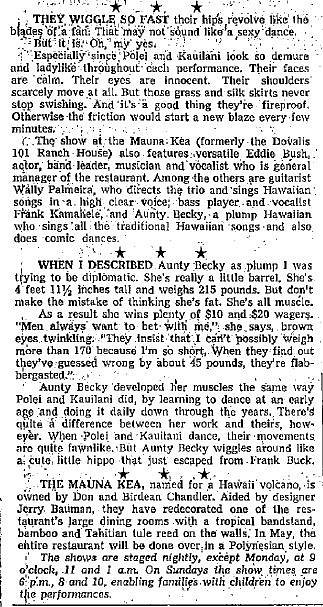 If you can believe it, all of the places mentioned above were large enough to have nightly Hawaiian entertainment and dancing. Included in that list is Don May's Leilani over on 2nd street. It had been around longer than the rest but it was still a happening night spot in 1963 with live entertainment every night as well.