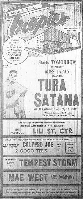 Bigbro, Missed ZuluMagoo's post when I was researching this, I know I had seen those leopard print outfits before. That is the all star line-up of Burlesque Queens if there ever was one. A little more info from Shimmy Magazine issue #2. When Warren St. Thomas opened the Tropics as a burlesque club in the mid 1940’s, he couldn’t have picked a better time. The war was ending, men were coming home, and burlesque stars had moved from the theatres into what had become a full-blown nightclub circuit. St. Thomas easily became a steady part of that circuit with his ingenious recipe for burlesque success