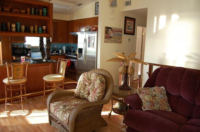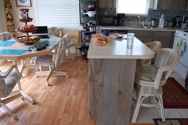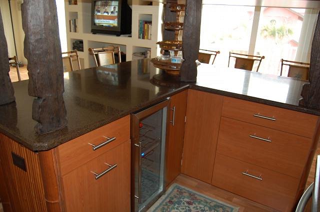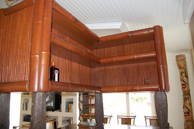 Our beach house has limited space and no stand-alone room to spare for a home tiki bar. So, I entered a plea deal with the spousal unit: in return for letting me replace the dining area table with a tiki bar, I agreed to remodel the adjoining kitchen. After giving away the dining table and demolishing the small breakfast bar which inconveniently seated a couple of folks directly in front of refrigerator doors, I created an L-shaped bar from base kitchen cabinets with space and an electrical receptacle for an under-counter wine cooler. The base cabinets (34.5”H x 24”D) were tied together with ¾” plywood sheets screwed into their back sides, forming the unfinished bar face. Taking a tip from DJKen in his TC post of last year, I obtained bronzed faux bamboo panels and molding from Texture Plus via their online web site (http://www.textureplus.com). These were then applied to the face of the bar using construction adhesive and a brad nail gun. The bar counter top is engineered quartz (Silestone), professionally cut and installed as a concession to the spousal unit (aka “she who must be obeyed”) who insisted on easy cleanup and no-maintenance durability. Next, a tiki bar overhead shelf unit was constructed of plywood finished with bronzed faux bamboo panels and molding, supported from the counter top by 24”H TikiBosko custom carved redwood poles. The overhead shelves on the bar face provide space to display tiki mugs and the like, while overhead shelves behind the bar accommodate storage of spirits and glassware. A polished brass bar foot rail ordered from KegWorks (http://www.kegworks.com) was assembled, cut to length and attached to the bar face using screws. Finally, a custom bar sign carved by TikiBosko (http://www.tikibosko.com) was hung from the ceiling joists using stainless steel eye lag bolts and locking spring snaps, and a puffer fish (blowfish) lamp by Swanky was emplaced atop the overhead bar shelf unit. Here’s a photo illustrating the “before” condition. Many of the cabinet doors were warped from water intrusion when the Florida hurricanes of 2004 liberated some of the roof shingles and subroof: