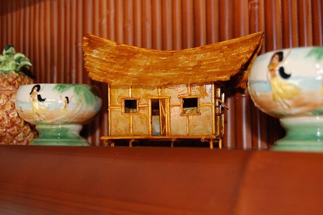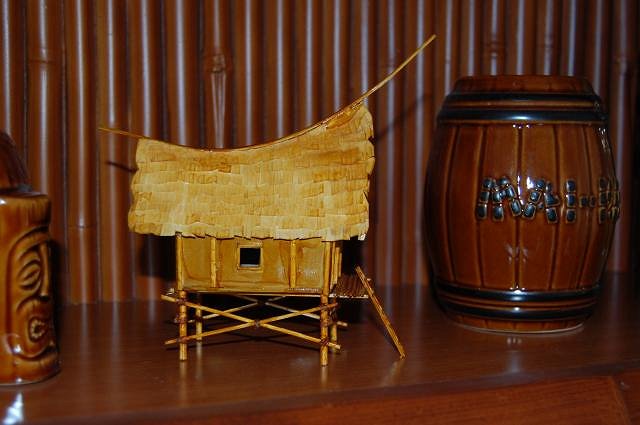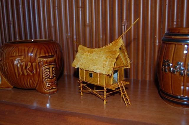 It’s a fabulous beach day at the Blowfish Bar, with cloudless sky and balmy temperatures in the low 80s. The trade winds have again blown favorably, bringing another treasure from the exotic isle of Kalamazoo crafted by Uncle Trav, that gifted maker of wee vintage Polynesian huts. Though birthed in arctic climes, it now basks on a warm shelf amidst kindred keepsakes evoking dreams of enchanting locales.