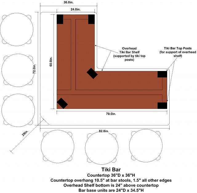 Big Kahuna, the Tiki Tom graphic is a personal logo dreamed up and created by that Wildsville artiste, Derek Yaniger. Writeup and graphic are included near the end of Derek's news blog of March 22, 2010 entitled "Peep the Poop!" at http://derekart.com/news/?paged=2 (you have to scroll down a bit). jokeiii, sorry but I was so busy with rushing to the end state with my limited vacation and holiday time that I skipped the in-progress photographic recording. However, I'd be glad to answer any particular questions about the construction. I created a layout drawing and bar profile before starting this to see how it would fit, including height from the sloping white beadboard cathedral ceiling. The biggest challenge was the tiki bar overhead shelf unit, custom constructed as four subassemblies in order to fit through doorways and stairway, allow attachment to the tiki top poles and not be too heavy to handle. The bottom L-shaped plate or base of 3/4" plywood with laminate finish surface (underneath side) was first, with screws and adhesive securing it to the supporting countertop tiki poles. The six tiki poles were secured to the quartz countertop with construction adhesive. Next the entire L-shaped inside shelving was assembled as one unit with plywood and stringers, with outside face that lipped over the base plate to be flush with the bottom. Note that the height of each horizontal shelf base was sized to be covered by the 3-1/2" width of the faux bamboo molding. It took three of us to lift and position the inside shelf unit over the base plate. Each leg of the L-shaped outside shelf was then assembled as a separate unit, and each was hauled up and positioned on the base plate. All three shelf assemblies were aligned atop the base plate, then screwed together and to the base plate. Next, the faux bamboo panels and molding were applied using construction adhesive and brad nail gun to create the finished surface. The bottom and top surfaces of each shelf were finished with laminate (Formica in wild cherry color pattern) to provide a smooth surface and blend with the color of the bronzed faux bamboo. Tom |