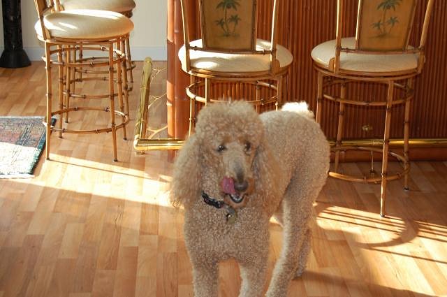 Then there’s that most important element of the tiki bar beyond atmosphere and good drink, affable company. Tango, our standard poodle, is always ready to fulfill that role…