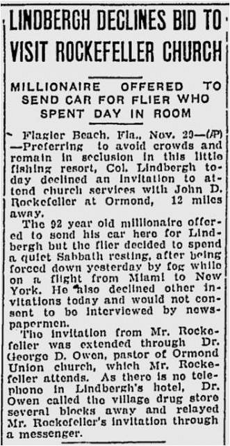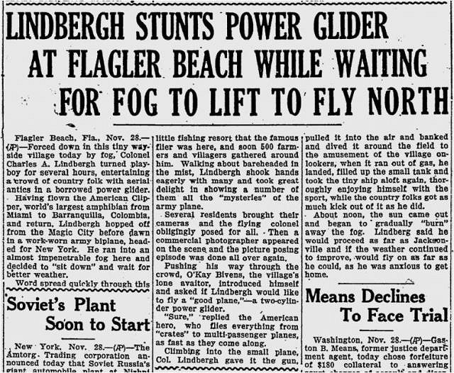 Flagler Beach is on a coastal barrier island and was originally known as Ocean City Beach, but the US Postal Service requested its name be changed to avoid confusion with like-named places in New Jersey and Maryland, so in 1923 it was renamed in honor of Henry Flagler (the railroad magnate), a personal friend of the founder, George Moody. In 1929, the town fathers established an emergency airfield with a flashing beacon several blocks west and extending to a block north of where the Blowfish Bar is now located. Two years later, one of the most famous aviators of all times, Charles Lindbergh, made an unexpected landing there... Charles Lindbergh next to his Army biplane in Flagler Beach The Evening Independent November 28, 1931 The Lewiston Daily Sun November 30, 1931 Lindbergh returned again for a longer stay in 1934. Amelia Earhart landed at this same field in 1936, as did Admiral Richard Byrd in 1932. The airfield was abandoned circa 1945, but you can still hike the marshy preserve that was the site of it over a boardwalk to the Intracoastal Waterway. At the center of town for more than 80 years, the Flagler Beach Pier has been rebuilt many times after hurricanes shortened its nominal 1,000-foot length. Its current length is 806 feet. Since the 1960s, it has featured an A-frame entry, but no tikis.