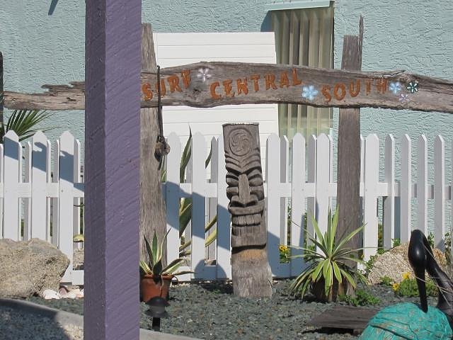 Flagler Beach is very much an escape to another place and time, in common with tiki culture. The public décor of the place is, however, principally a coastal nautical style, somewhat dominated by surf culture icons (boards, woodies, etc), with a sprinkling of Caribbean elements. There are a few tikis to be found, usually in a mixed setting, such as this one a block south of the Blowfish Bar...