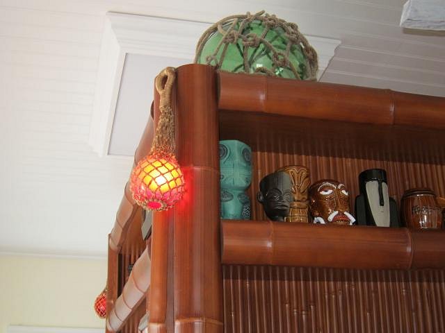 With encroaching darkness, a Swanky puffer fish lamp has served from the beginning as the valiant, but lonely beacon of the Blowfish Bar. It's been sufficient to plot a general course, but after a few high proof tropical cocktails, it's been apparent that some additional aids to navigation were needed to avoid piling up on the reef. The solution... TikiSkip red float lamps, hung from the corners of the overhead shelf unit...