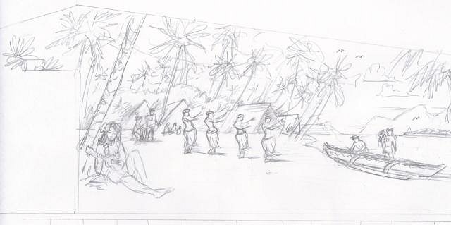 Thank you, Blue Kahuna, TikiSkip and Pele Paul, for the feedback and encouragement. The home bar is an ever evolving enterprise... I've been talking to a local artist about painting a mural on the stairway wall adjacent to the Blowfish Bar. Here's an early concept sketch using the same Polynesian scenery elements presented in panoramic glory on the mural at Julian's, but flipped around and scaled down a bit; the artist intends to alter details to his own style (scanned image truncated a bit)...