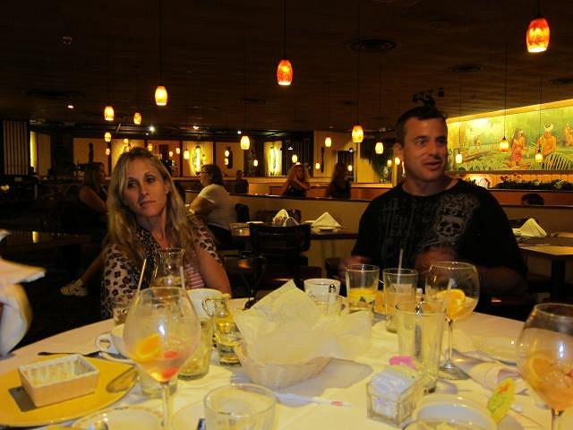 Party time at the Blowfish Bar last night! Joining us were our Space Coast friends, TikiHardBop (George), TornadoTiki (Chris), and metikigal (Christina), as well as Miami friends, Joanie and Oliver. Mai Tais were the featured drink. Two variations were offered. One was based on the contemporary “Royal Mai Tai” created by Joey Gottesman, an “island” (aka “tourist”) style cocktail offered at the Royal Hawaiian Hotel’s Mai Tai Bar in Waikiki and first featured in the July/August 2009 issue of Hawai’I Magazine: http://www.hawaiimagazine.com/blogs/hawaii_today/2009/10/8/mai_tai_Hawaii_recipe_Moose_Royal+Hawaiian/2 Royal Mai Tai ingredients While a very flavorful drink, all of us agreed that it was quite a bit sweeter than our taste preferences, much in common with the Mai Tais we encountered on our Hawaiian island vacations. The cocktail that we all agreed was very fine (“the best”) was based on the original Trader Vic Mai Tai recipe recapped on page 71 of Beachbum Berry Remixed, with slight modifications: 1 oz amber Martinique rum (used Saint James) The spousal unit, Pat, made appetizers to balance the cocktail spirits. Being of Italian heritage, she over-excelled with this task, with a rollout of food that included Native Drums (page 31 of Beachbum Berry’s Taboo Table); smoked salmon dip; boiled jumbo shrimp and cocktail sauce; meat balls; summer sausage, cheese and crackers; pigs in a blanket, and salsa with tortilla chips. This sure didn’t leave much room for our planned dinner trip to Julian’s. Swanky’s Vinyl Exotica I and Vinyl Exotica II (http://www.swankpad.org/exotica/exotica.htm and http://www.swankpad.org/exotica/exoticaii.htm) rendered the perfect sound ambience. Playback was from an iPod Touch connected to a Bose Wave Music System. After a few drinks, we found out from Joanie that Oliver plays a mean guitar. So, we dispatched Joanie to retrieve his guitar and were rewarded by an afternoon of spirited guitar play, passionately delivered in a variety of musical genres. Not only was Oliver a talented player, but he was also an equally talented vocalist. Chris (TornadoTiki) and Christina (metikigal) George (TikiHardBop) Christina and Pat Oliver Oliver and Joanie Calista, our standard poodle, seeking attention Chris and Christina, with Tommy and Joanie at edges Tommy (our son) and Kathy Tango, our other standard poodle, just chillin' A gift to the house of George’s peach-mint infused bourbon liqueur We all concluded the day with dinner at Julian’s Dining Room and Lounge in Ormond Beach. Chris and I, as designated drivers, curtailed our intake several hours before departure, intended at 6:30 pm but actually closer to 8:00 pm, while we partied to Oliver’s guitar play. The food at Julian’s was excellent as usual, though the entertainment was not. Fortunately, the latter was drowned out by the banter of the dining room crowd. Christina and Julian’s magnificent Polynesian mural Joanie and Oliver at Julian’s Life was indeed good in the great company of friends, the best of all mixers... -Tom