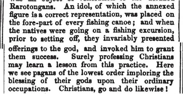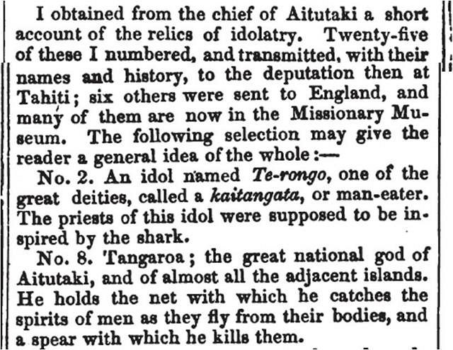 In Rarotongan theology, Tangaroa was the Fisherman’s God. As the principal god of Rarotonga, his domain was fishing, voyage and prosperity. In her 2010 Master’s thesis at the Auckland University of Technology, Through the Eyes of Tangaroa – A Voyage in Visual Form, Loretta Reynolds provided a wonderful overview in words and images of the subject. Also of interest, she cited Sven Kirsten, TC’s own learned authority, in her thesis. Much of what is known about the Cook Islands Fisherman’s God came from Reverend John Williams, an English missionary of the early 19th century who voyaged widely among the islands of the South Pacific and wrote of his experiences in A Narrative of Missionary Enterprises in the South Sea Islands, originally published in 1837...