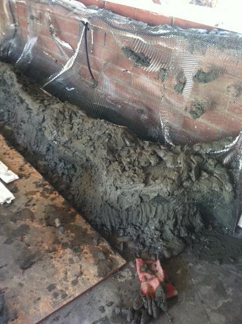 Building the framework for the lava rock waterfall.