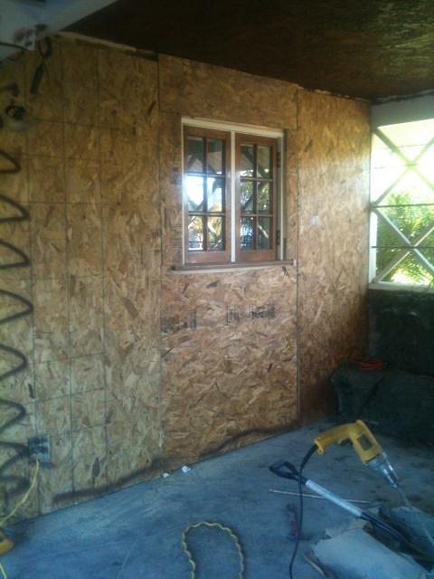 The walls are going up. We have to use this plywood so that we can mount the bamboo and lahala matting to the walls. Stucco isn't good for anything...
