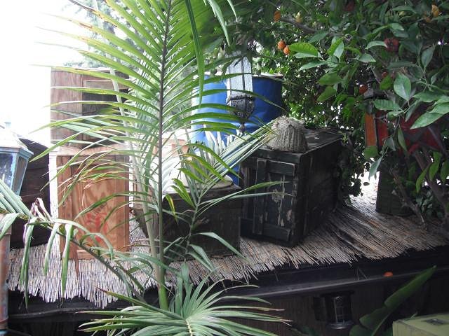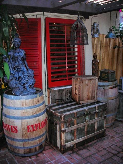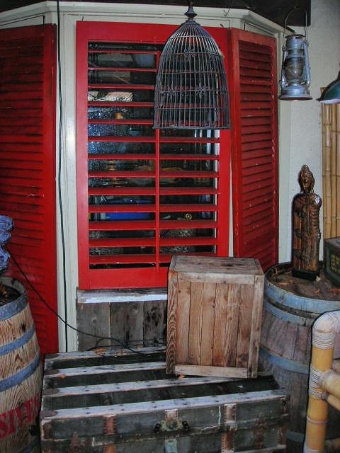 That is the backyard that I dream of having. Great selection of goodies that really give off the vibe of being in a remote jungle depot center. I hear glenn miller or benny goodman in the background. FANTASTIC!!! I REALLY love those red louvered shutters. They add a nice color and, for some reason, make me think of the Monkey Bar in Tales of the Golden Monkey. |