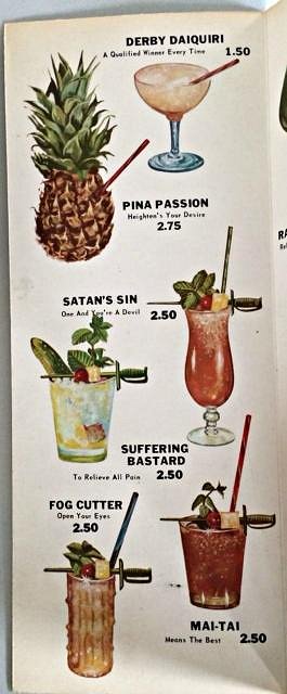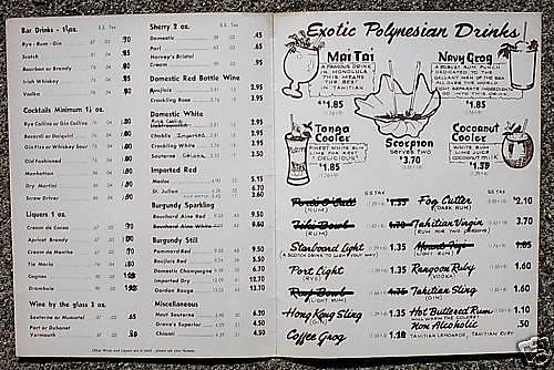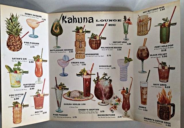 Well take a look at this impressive drink menu (spotted on ebay) from the Kahuna Lounge at the Mai Tai! Some great variations on the classic Tiki drinks names.