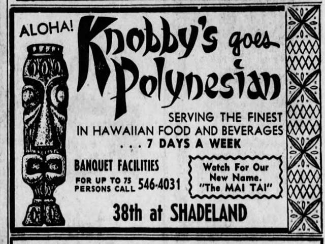 Two more ads from Knobby's announcing that they were going Polynesian and using the Mai Tai name.