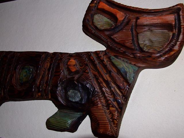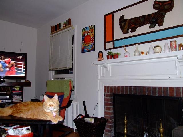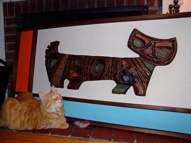 I'm very pleased (especially after today's entry under Tiki Mug Misfortunes) to show off our recently found Witco wall hanging. According to the 1964 catalog that's pictured in Tiki Modern, this is called "Color Cat." We were very fortunate to find this particular one, as its colors and carving both suit our living room colors quite well. It did mean adding a 3rd cat to the family, but the upkeep on this one is far less demanding than our 2 orange tabby cats. Christy's holding it - it's about 5 feet wide: Here's a closeup of the head part of the carving: And here is our orange tabby Neko, giving her approval to the addition to the family: And here's Neko with color cat in situ, over the fireplace. Ironically, the poster next to it is for a WILCO concert! Cheers, |