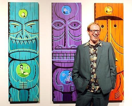 Photo Caption from the Seattle Times: Josh Agle, better known as Shag, has a laugh in front of his paintings "Ekahi," left, "Ekolu," center, and "Elua" (acrylic on panel) at the opening of "Tiki Art Now! 3" at Roq La Rue in Seattle. The Southern California-based illustrator and designer's works are a blend of cocktail and tiki culture. |