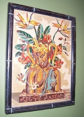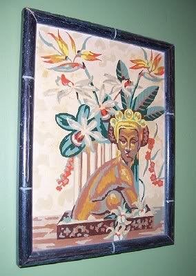 The last thing is this pair of paintings. They look like they are paint by numbers. On the back is a sticker for "Van's Art Shop, Artistic Picture Framing, 2604 Jay St. GI. 3-2841". I bought these from an antique store and I recall them being labled as Hawaiian, but they seem Aztec-ish?