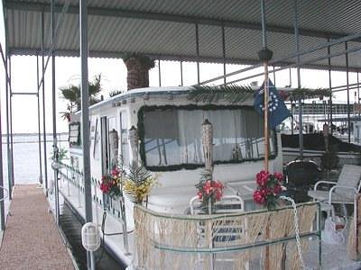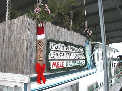 OK, here's a few in-the-slip pics I took of the Christmas decorations, after the Lighted Boat Parade. I'll be re-doing the cane fence around the upper deck, and refreshing the grass skirting around the front rail, before the next parade in May.
