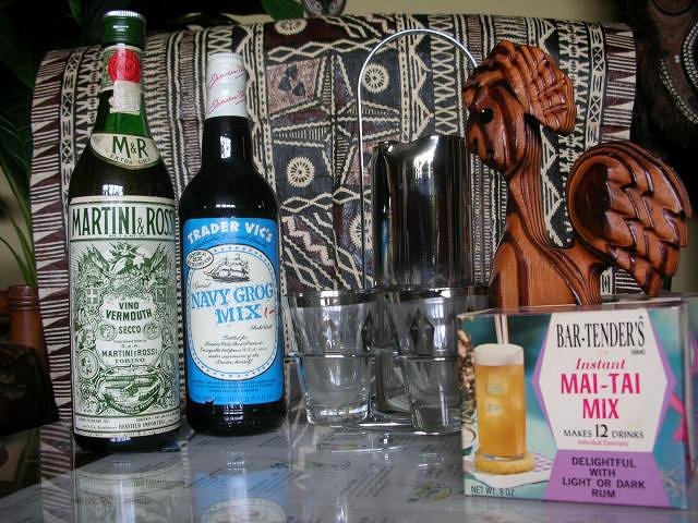 estate sale finds: a dollar each for vintage TV Grog Mix & Vermouth, 2 boxes of Mai Tai Mix, vintage glassware and a fake witco rooster.