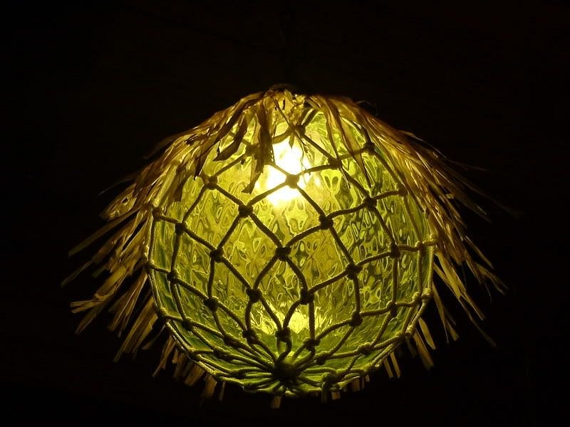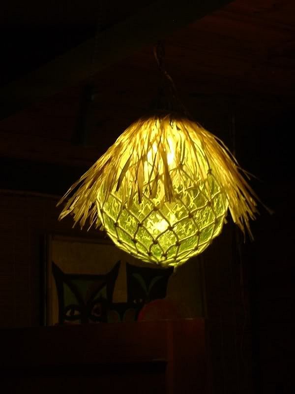 I don't think it's perfect just yet, I think I can wrap the grass skirt better and maybe add another "ring" around it to see if that thickens up the shade. But you get the jist and see that it's easy to make a false globe float lamp. It depends on the make of the glass (mine is wavy) but if you get a clear enough globe (and big enough around) you could possibly put a puffer lamp inside. |