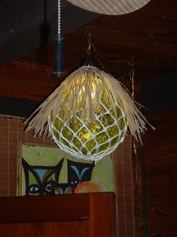 I picked up a 70's swag lamp at a thrift store for a song, but I mainly wanted it because the globe was round and perfect for my project. I then picked up a cotton basketball net and a new swag lamp kit. I was originally going to wrap the top part of the lamp (that held the socket)with a similar rope. Now as I write this I realize that I didn't do a step, but it's not crucial, I can dismantle the lamp and do this: stain the rope. I was thinking of a tea stain to give the rope a used and dirty look. Well, my project just sat on the side and after I constructed it, I realized that it just didn't look right. Then one night at Trader Vic's I spied this lamp (with the raffia shade):