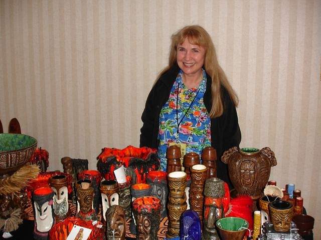 Hi Psycho, if we hadn't become tiki collectors we would be thinking about retirement from our day jobs. Instead we adapted the motto, Will Work For Tikis. When you spend a lot on tikis you sacrifice things like long distance vacations. I've barley been over the boarder to Canada and Mexico. I doubt I'll see Europe in this lifetime. But you know what I wouldn't trade all the friends I've made through tiki for an overseas trip. Friendships last longer. Wendy ps Hi 1961Surf and Atomic chick just two who I saw at Oasis. Working Gecko's booth in Thors room. |
